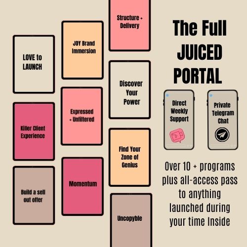 JUICED ON YOU: THE MASTERMIND is a 6-month business and embodiment container for the woman ready to UNFILTER herself, lead from the deepest, juiciest, most EXPRESSED self.